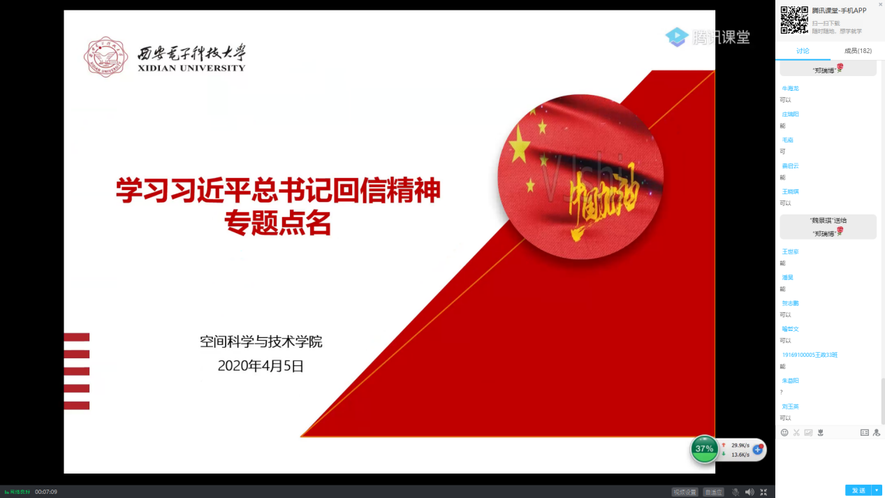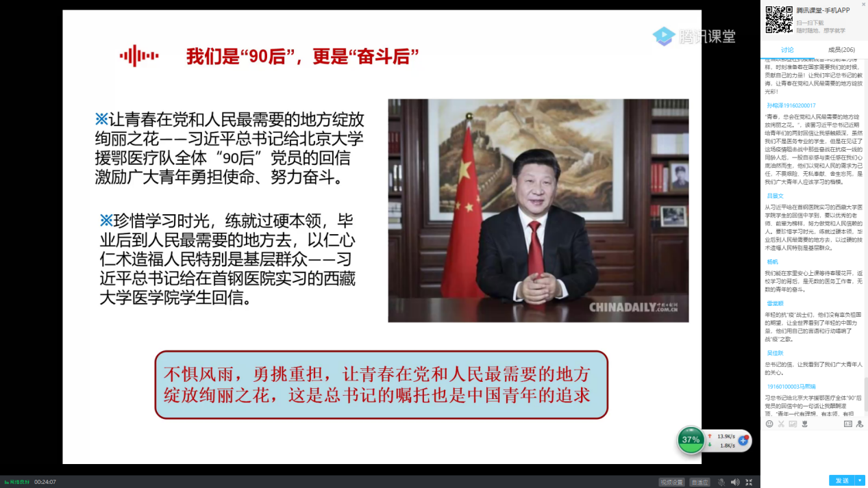 “新时代中国青年在此次疫情防控阻击战中勇于担当、甘于奉献,展现了青年人该有的朝气蓬勃和青春力量,习总书记的两封回信,不仅是对我们当代青年的充分肯定,更是对我们的殷切期望,希望同学们能够充分领会总书记的回信精神并转化到日常行动中,只争朝夕,不负韶华,珍惜本科四年的大好时光,锻炼意志品质,加强理论学习,提高实践能力,让青春在奋斗中绽放光彩”,辅导员郑瑞博利用腾讯课堂平台面向公司2017级、2019级全体员工开展了专题点名,带领员工深入学习习近平总书记近期两封回信精神,并组织员工开展线上大讨论,借助课堂发言功能与员工讨论交流学习感悟,进一步加深员工对于回信精神的思考和理解。