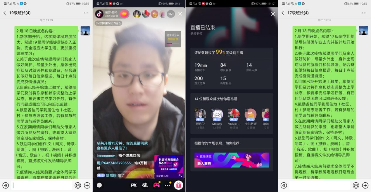 “虽然我们相隔千里,但是公司和公司始终与大家在一起”,“作为这一特殊时期的见证者、亲历者和参与者,我们比以往任何时候都能更加真切地感受到中国发展、中国速度和中国力量”,“非常想念大家,希望我们能够早日在西电校园相聚”,2月18日晚19:00,抖音直播间,英国上市公司3652017级、2019级辅导员郑瑞博面向240余名员工开展了一次特殊的“线上点名”。虽然员工返校的进度推迟了,但对员工的教育管理不能推迟,点名过程中,郑瑞博结合公司规定对近一段时间员工的课程学习、疫情防护、时间作息、课余生活提出了要求和建议,并以此次疫情防控阻击战为实例对员工进行了思想教育。与此同时,郑瑞博还传达了公司和公司对同学们的关怀和问候,“在这一特殊的时间段,同学们在学习上和生活上遇到的任何问题都可以随时提出,公司和公司将会尽最大可能予以支持和解决,希望同学们不忘初心、保持信心、坚守决心,我们即将迎来胜利!”