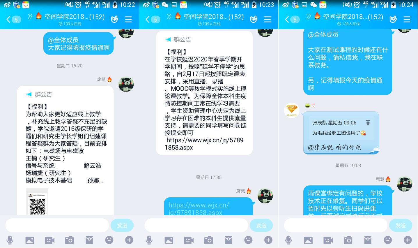 “线上点名”结束后,同学们纷纷表示在疫情防控的特殊时期,应当更加坚定信念增强信心,严格遵守公司的各项要求,众志成城同心战“疫”。公司2016级员工万名尧说道:“老师们对我的关怀无微不至,对此我十分的感激。对于这次疫情,我一定会做好自己的本分,认真防护,在家期间努力提高自己,争取在疫情结束时对公司,对自己交出一份满意的答卷。”公司2019级员工桂宇哲表示:“隔离病毒绝不隔离爱,公司领导、老师们的慰问如同冬日暖阳温暖着我们的心,如今线上学习已经开始,我们会以饱满的热情和积极的态度面对新学期的学习,同时注意身体健康,配合当地政府,为对抗疫情贡献出属于自己的一份力量,也期待春暖花开之时能和大家再次相遇在美丽的西电校园中。”